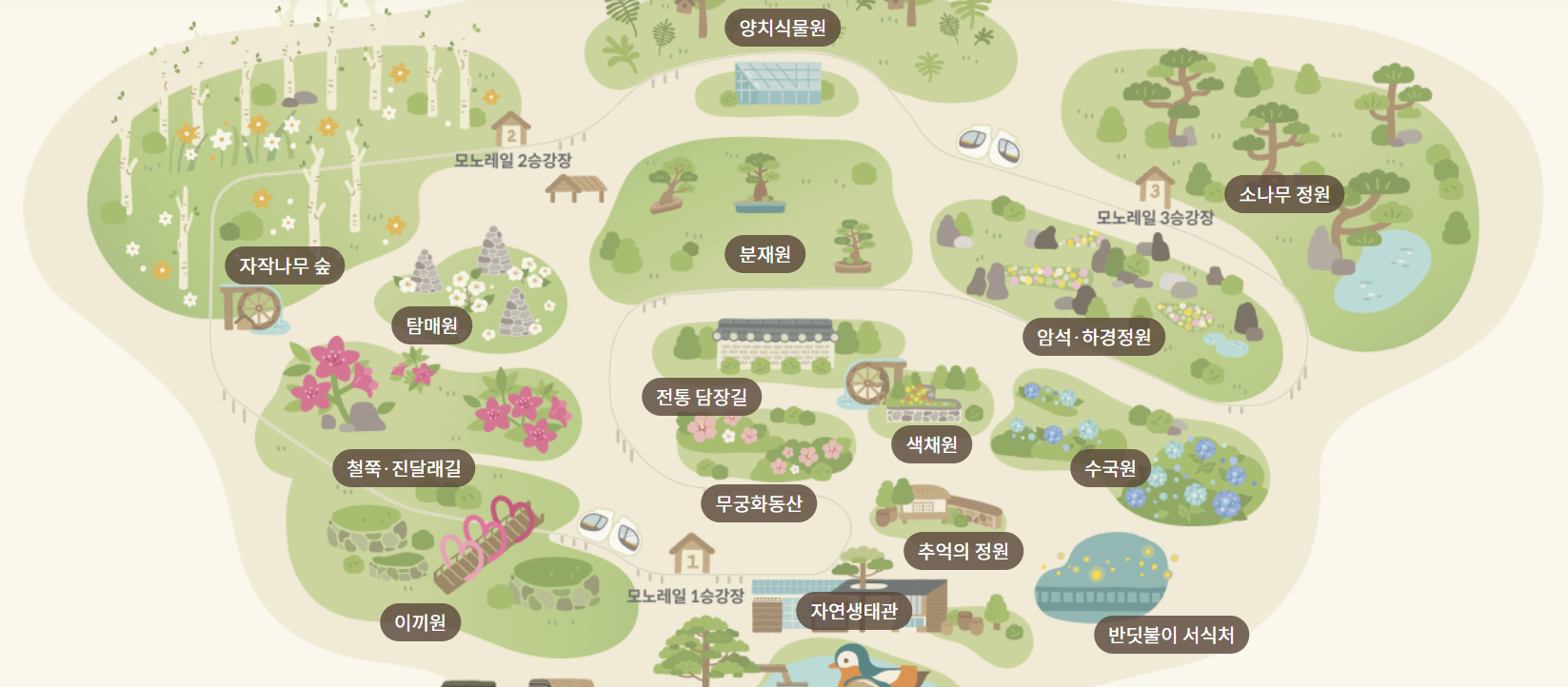 양치식물원, 소나무정원, 분재원, 암석하경정원.
