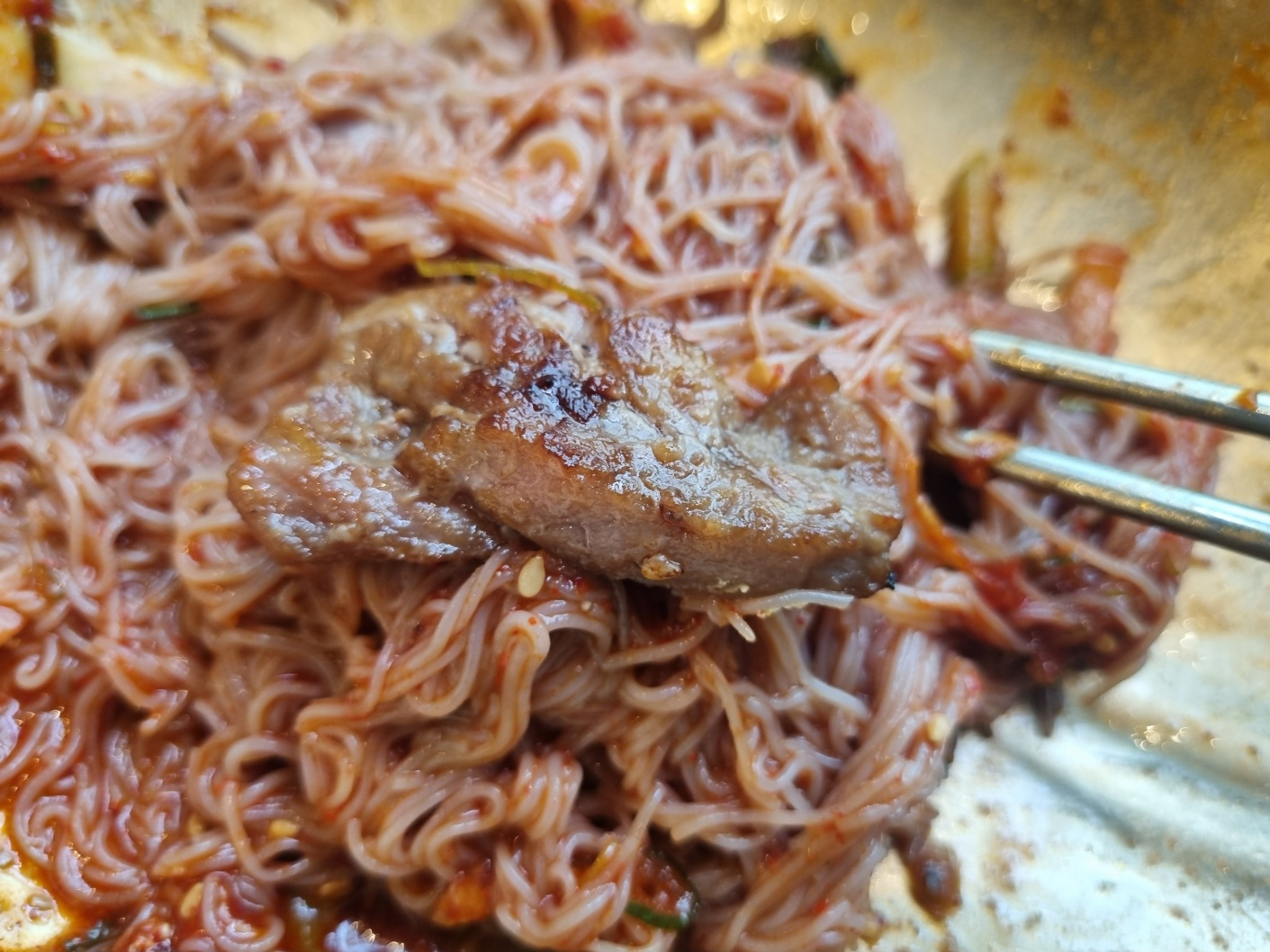 냉면에 고기 한 점을 얹고