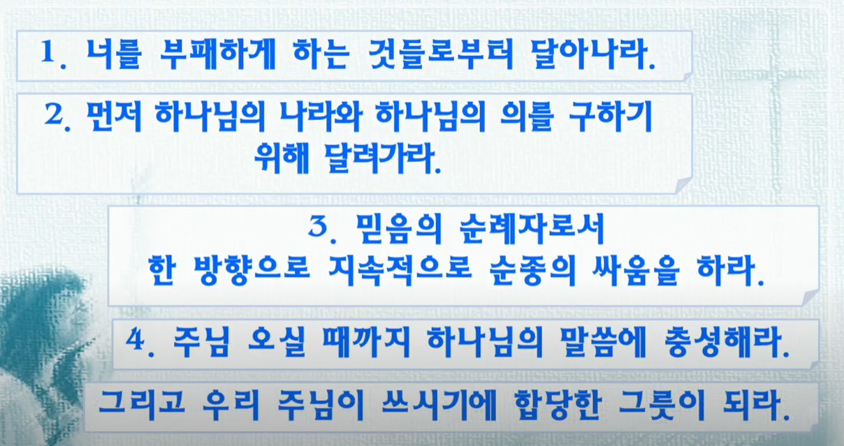(의, 경건, 믿음, 사랑,인내, 온유)