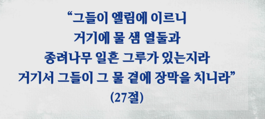 마라를 지나면 물 샘 열둘이 있는 엘림이 있어요