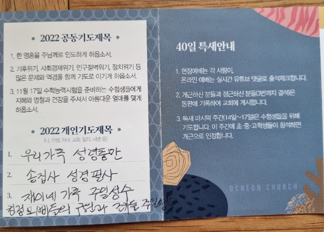 | 결혼 40주년에 ...../ 새벽 기도회와 선물 (2) | 2022.11.05 |