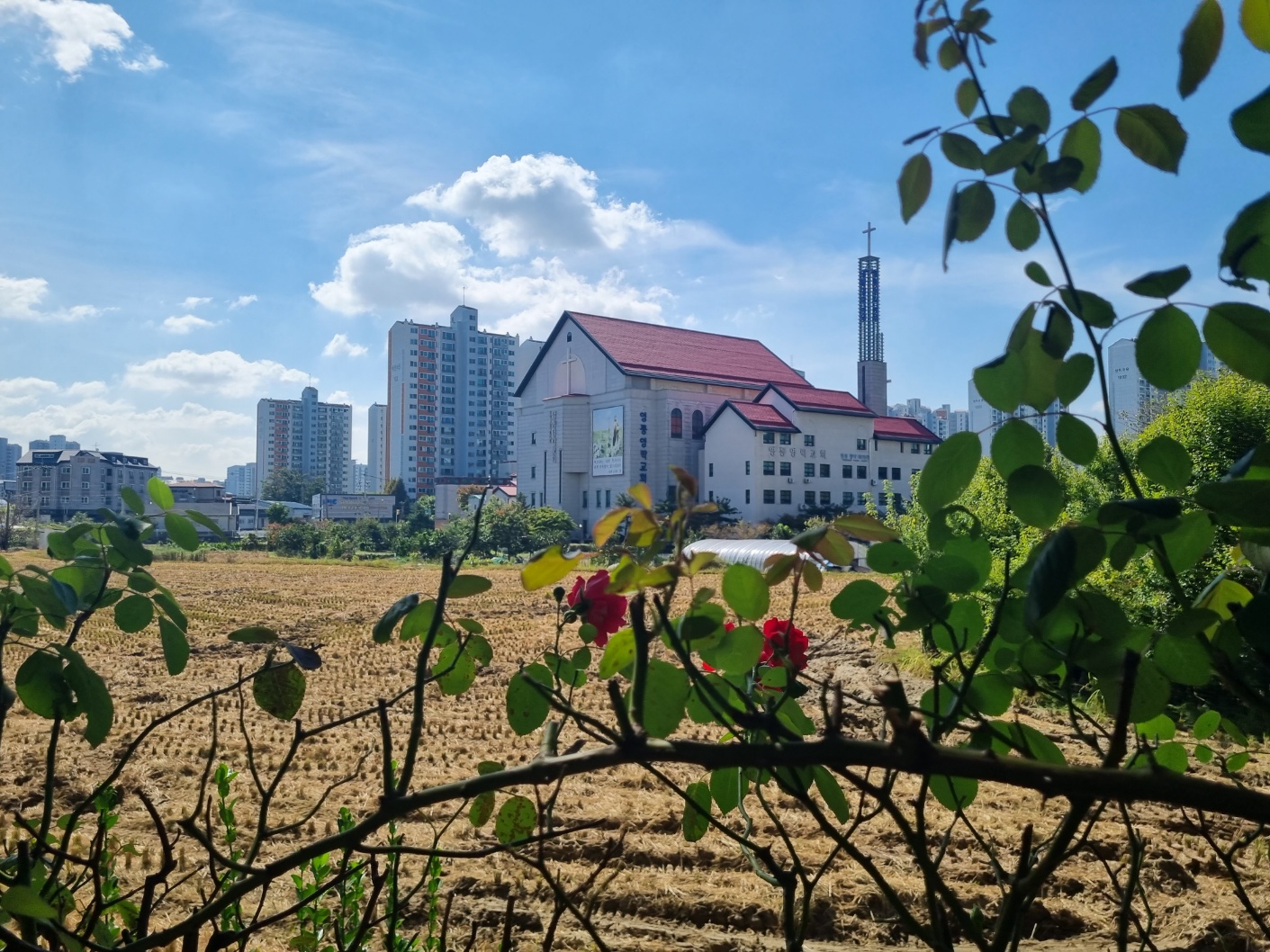 푸른 가을 하늘과 장미꽃