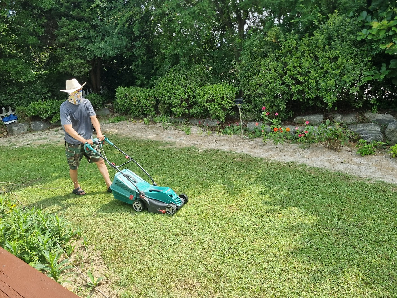 남편은 마당의 잔디도 깔끔하고 자르고요